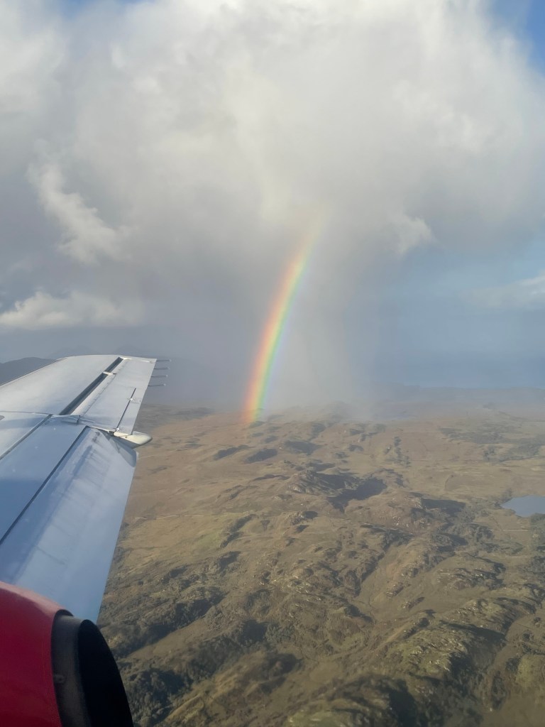 Always a little sad to leave a new friend. That is the way I think of Islay as a new friend. She opened her doors to Katy and me and showed us all that she had to offer. From the incredibly friendly people – did matter where you were, the people of Isaly are outstanding. To the extraordinary landscape and history. If you have the opportunity to come to Islay, take the time to explore and see what God has done with this island. Take your time; it’s easy to get around, so don’t rush it. Around every hill, every curve, every stop for a question is another treat. Yes, Islay is known for its great scotch, so please experience that as well. But understand there is much more. Maybe it was the season, but I was not ready for all of the vivid rainbows. Even as we were about to board our plane this morning, Islay gave us one last rainbow, sort of its way of saying goodbye.
